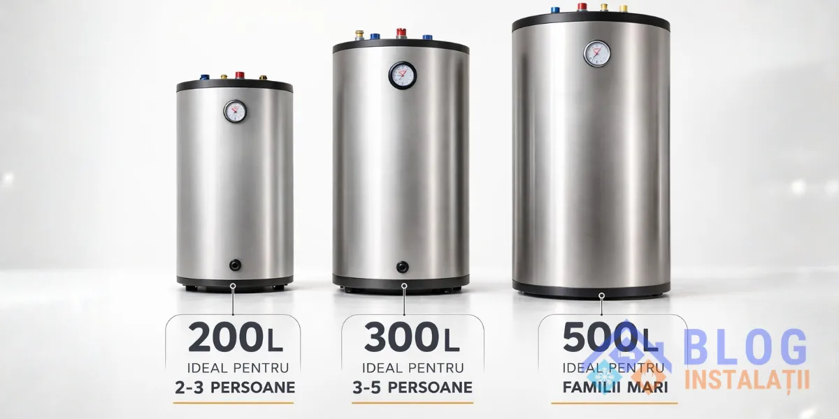 | 3–4 persoane | 150–220 L/zi | 200 L | 250–300 L |