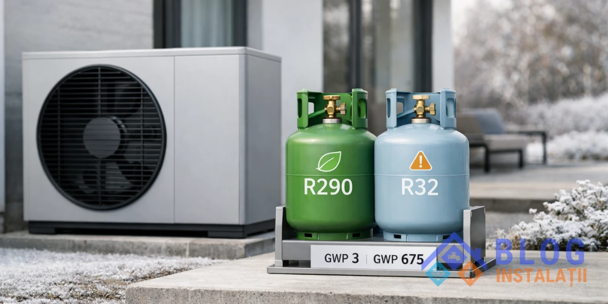 R290 (propan) este, pentru multe pompe de căldură moderne, un refrigerant superior datorită impactului asupra mediului de 225 de ori mai mic decât R32 (GWP de 3 vs. 675) și a capacității de a atinge temperaturi de 75°C necesare pentru radiatoare. În schimb, R32 rămâne o alegere practică pentru sistemele de climatizare și încălzire în pardoseală. În 2026, legislația europeană favorizează tot mai mult refrigeranții naturali cu GWP aproape de zero.